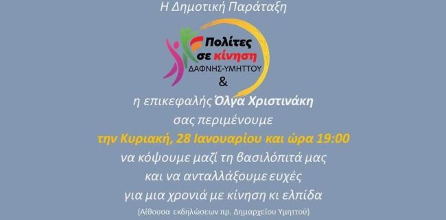 Οι Πολίτες σε Κίνηση Δάφνης Υμηττού και η επικεφαλής Όλγα Χριστινάκη σας περιμένουμε την Κυριακή 28 Ιανουαρίου και ώρα 19:00 στην αίθουσα εκδηλώσεων του πρώην Δημαρχείου Υμηττού να κόψουμε μαζί τη βασιλόπιτά μας και να ανταλλάξουμε ευχές για μια χρονιά με κίνηση και ελπίδα! Θα είναι χαρά μας να βρεθούμε όλοι μαζί!